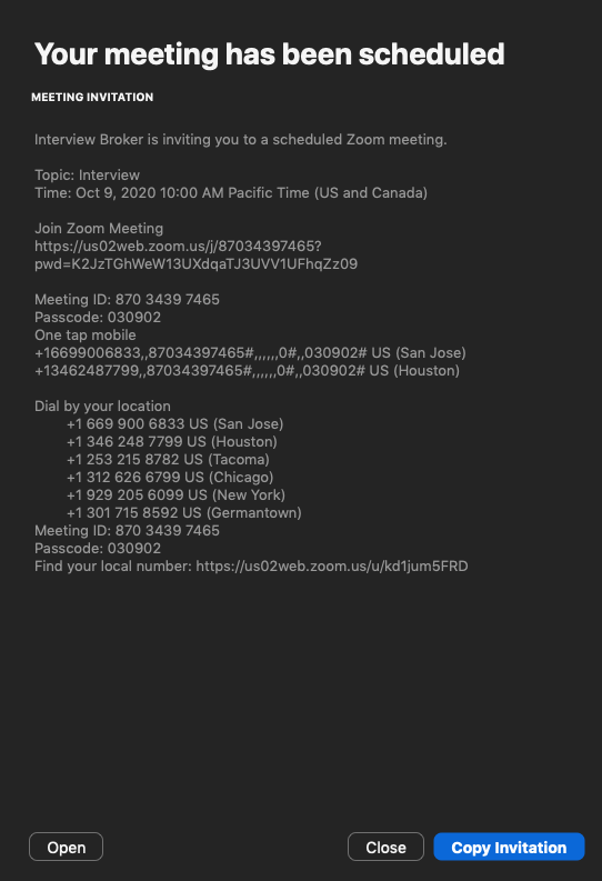 In order to send the Zoom meeting info to your applicants, you can include the Zoom meeting information as part of the Interview Day Details email.